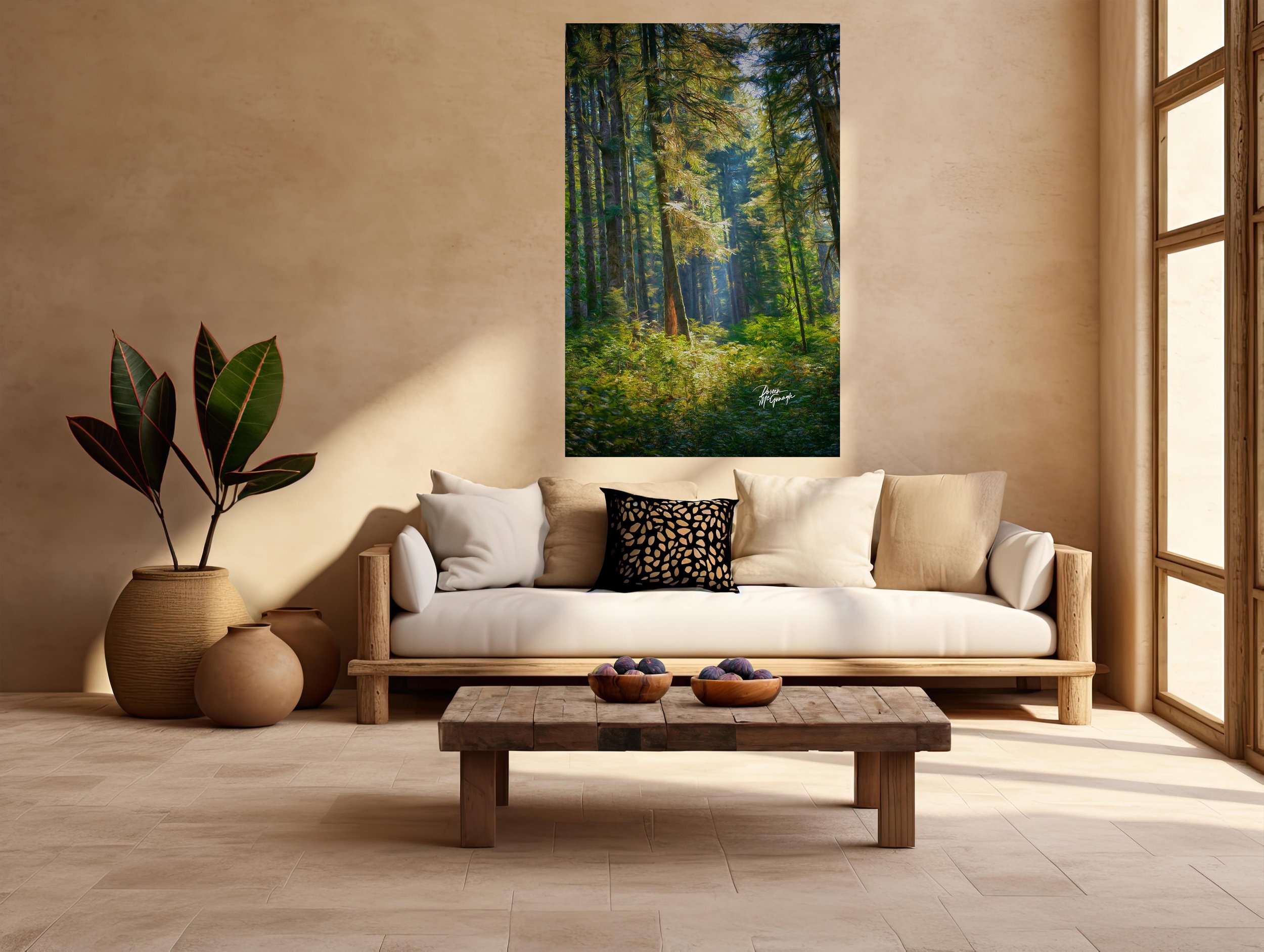 I waited for the sun to slip between branches at a low angle, when the canopy turns into a natural diffuser. Bands of light moved across the understory like slow breathing—illuminating moss, lifting ferns, and tracing the grain of bark. What I felt most was clarity through stillness: strength in the trunks, tenderness in the light. That feeling anchors the photograph and the rooms it inhabits.