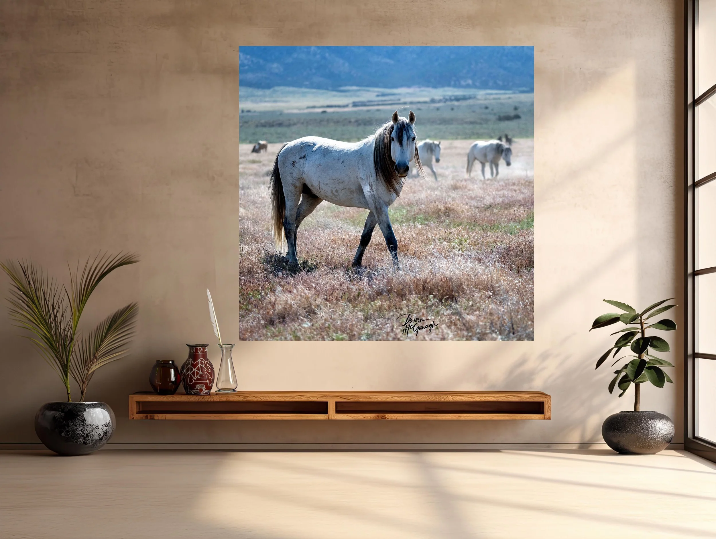 An evocative addition to interiors. Onaqui Reverie in Dry Fields brings warmth and quiet energy into a wide range of design environments. Its neutral palette complements earth-toned spaces, organic interiors, and modern minimalist rooms alike. In living areas or entryways, the horse’s poised presence creates a sense of welcome and calm. In offices, libraries, or meditation spaces, the image offers grounding and focus, reminding viewers of the enduring power of stillness. Large-format prints emphasize the expanse of space and texture, while smaller editions allow for a more intimate appreciation of detail.